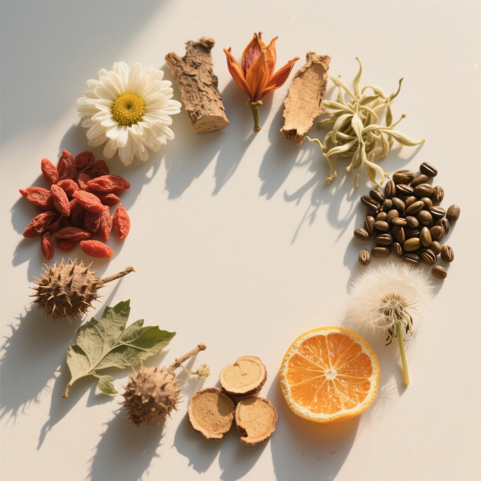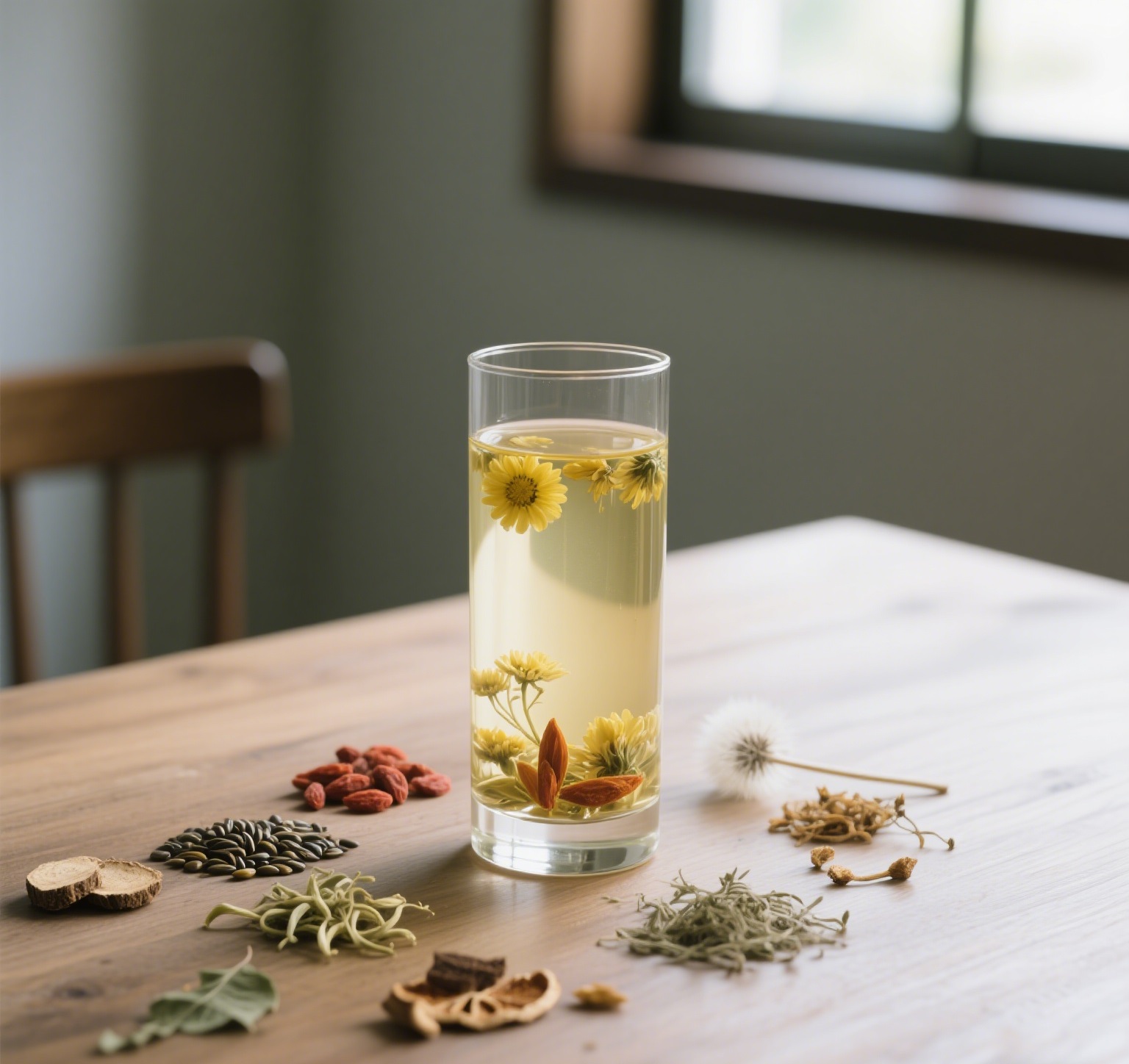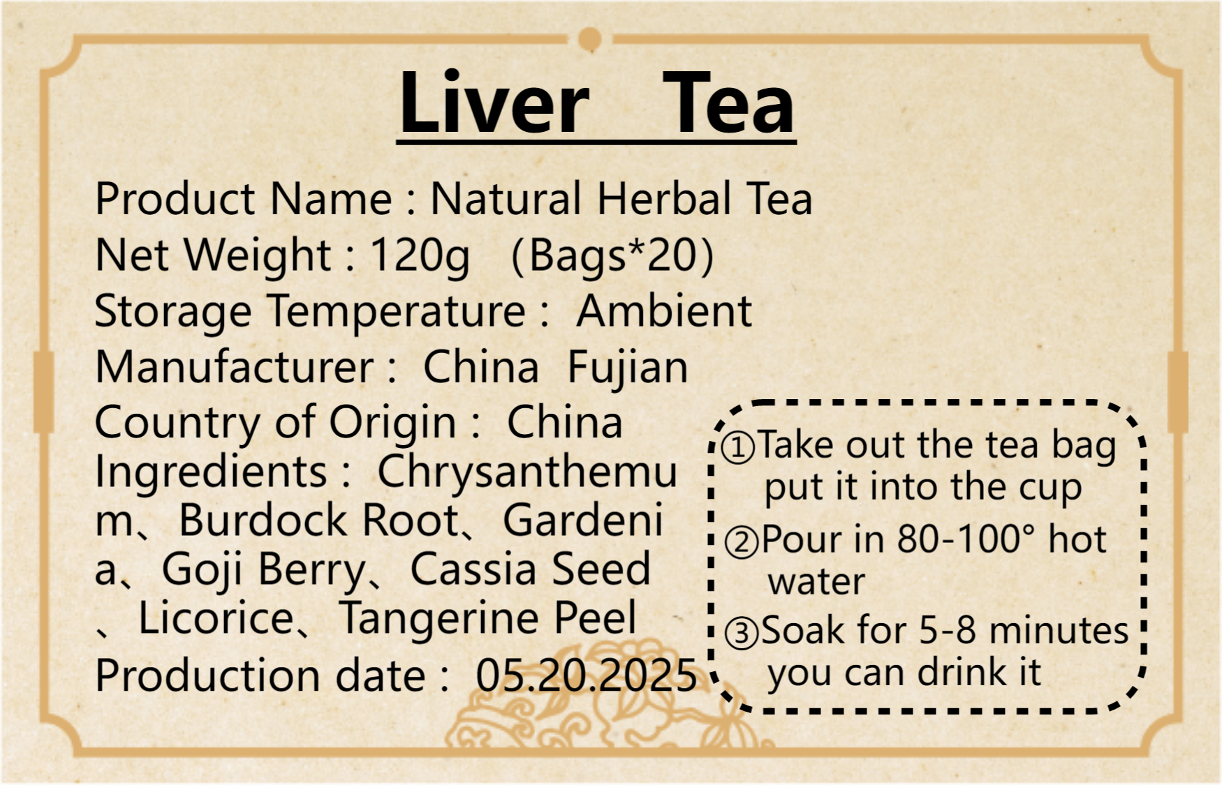 Selected from nine herbs: chrysanthemum, goji berry, burdock root, mulberry seed, gardenia, honeysuckle, dandelion leaf, licorice, and cinnamon. Scientifically formulated.